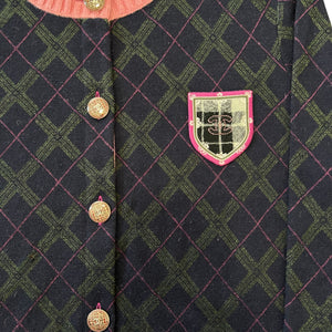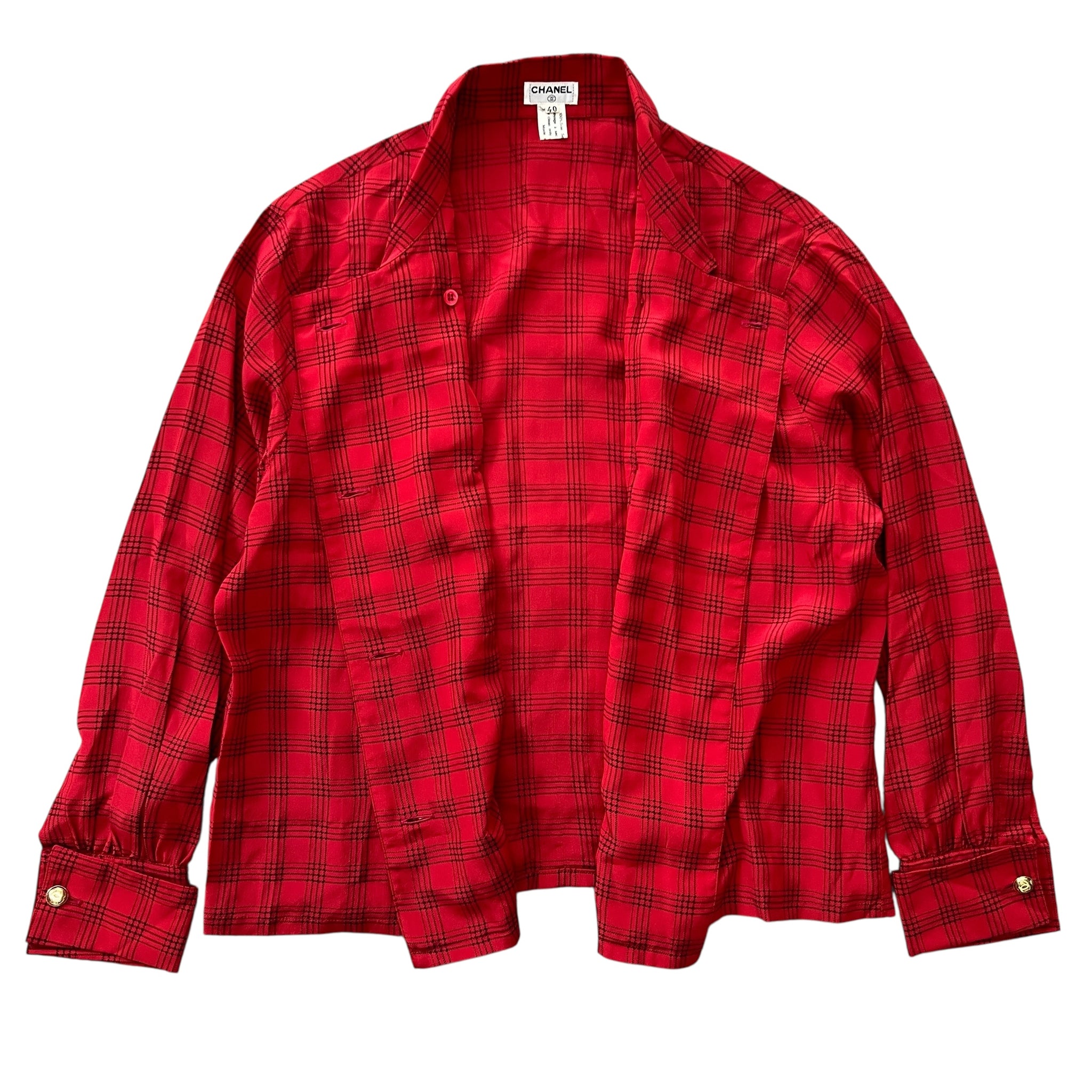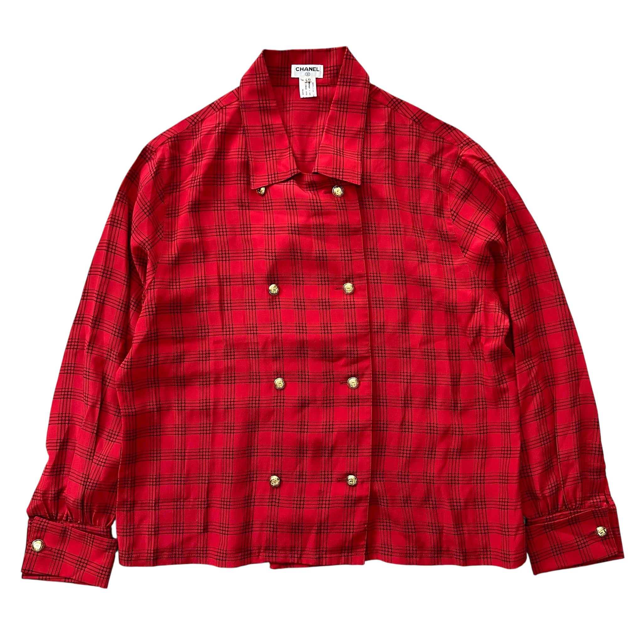 CHANEL 90's Tartan-Check Silk Shirt Double-Breasted With gold chanel logo button